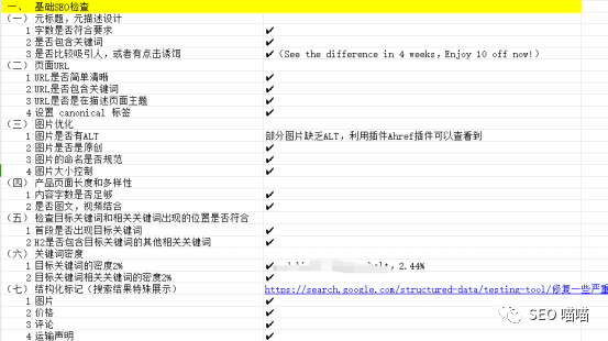 基础SEO检查要点:(需要excel版本的可以关注公众号,点击菜单“联系喵喵”获取)