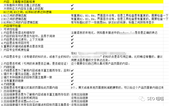 内容SEO检查要点:(需要excel版本的可以关注公众号,点击菜单“联系喵喵”获取)