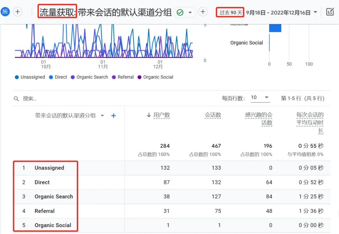 点击跳转进入到“流量获取”部分,将会显示不同流量来源的访问数据,Google Analytics(分析)默认将流量分为其他来源、直接访问、自然搜索、转发和社交媒体。