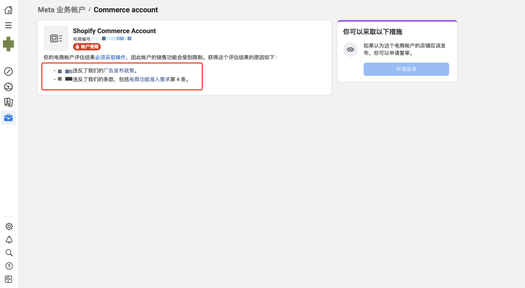 PS:本文章主要围绕第3条要求展开拆解,实际上只要其中一条不符合都无法开通Shop功能。下图中的电商账户受限是违反了第1条和第4条要求,Shop功能被限制。