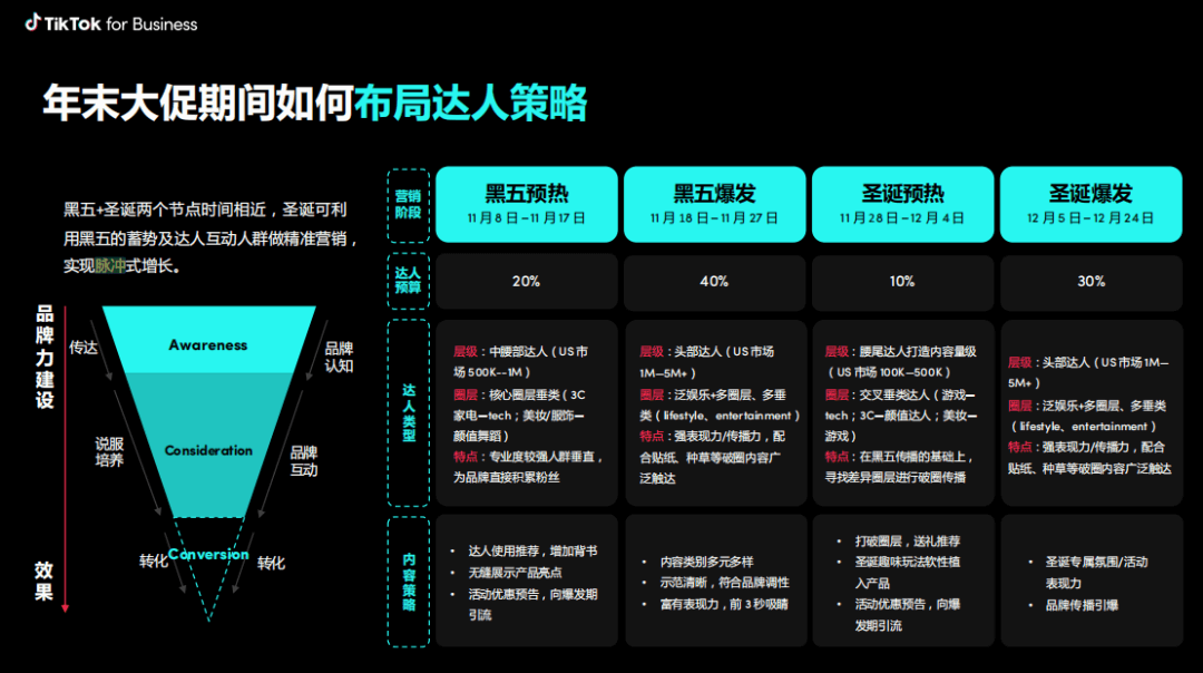 今年大促期间,为了让商家更好地把握平台流量和达人营销玩法,TikTok for Business基于对平台数据以及用户、达人、本地市场和内容趋势方面的洞察,提供了全链路达人营销服务,将从大促不同营销阶段入手,为商家提供从预算、达人类型到内容策略方面的详尽解决方案。