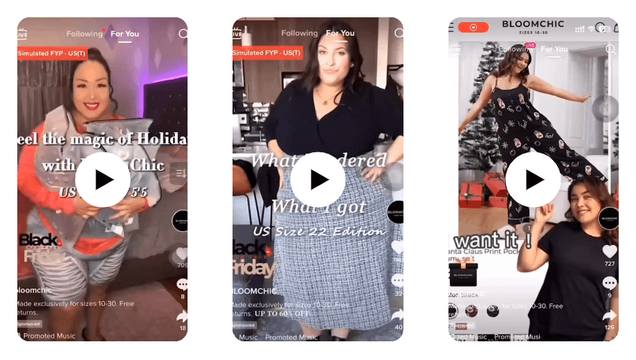 另一家大码女装品牌BloomChic,也通过使用TikTok for Business提供的广告产品,实现了美国市场的投放目标,带动了广告支出回报率的增长。