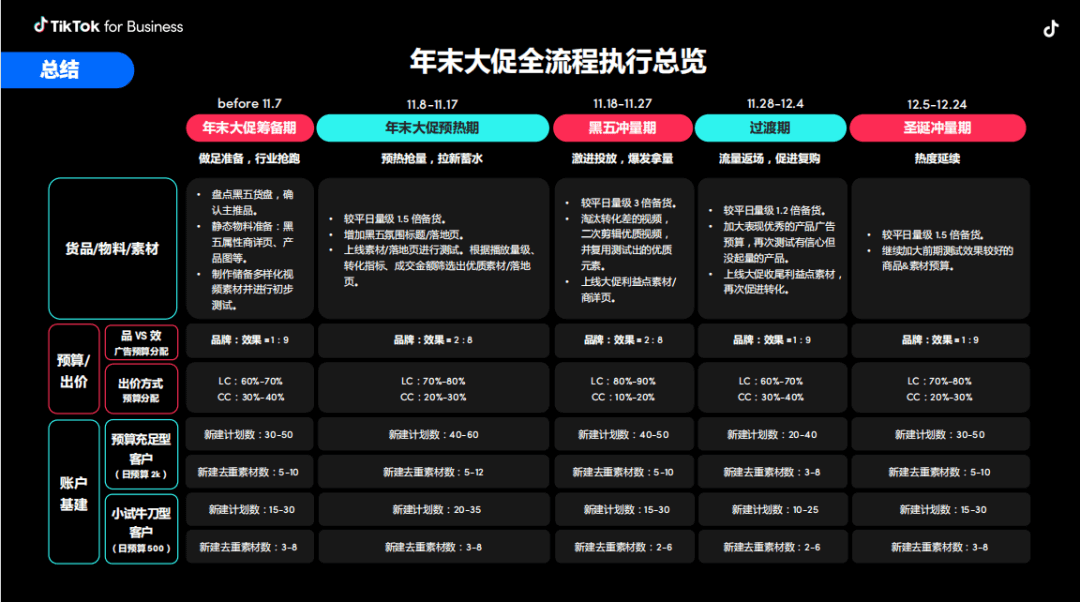 从黑五、网一到圣诞和新年假期,年末大促节点密集。在TikTok for Business的年末大促全流程框架中,系统梳理了商家在筹备期、预热期、黑五冲量期、过渡期及圣诞冲量期这五个阶段的营销重点,以及相关的备货节奏和广告投放策略,助商家实现投放效率最大化,带动产品销量持续增长。