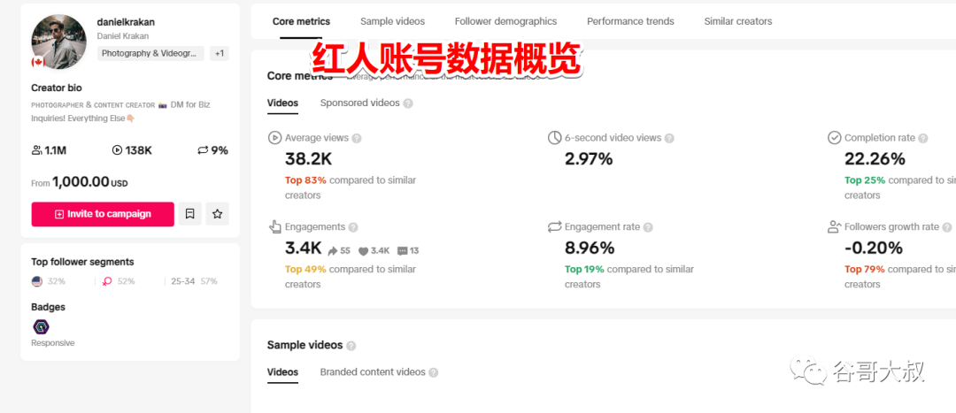 这是目前我们内部用的最多的一个工具,在站内搜索到的红人只要注册过这个平台也都可以查到数据。我们1500多万播放量的网红也是在这个平台上找的,价格是80美金。