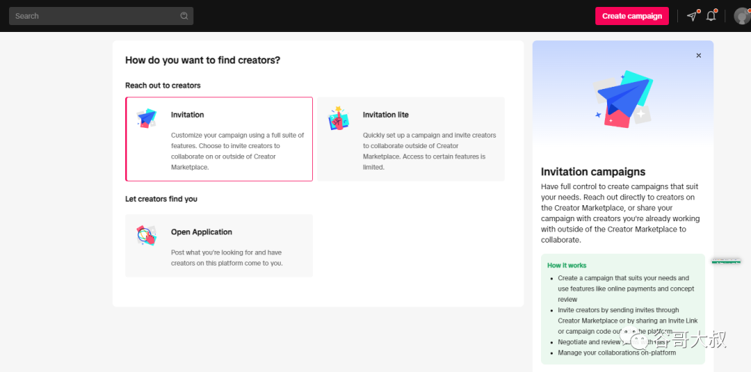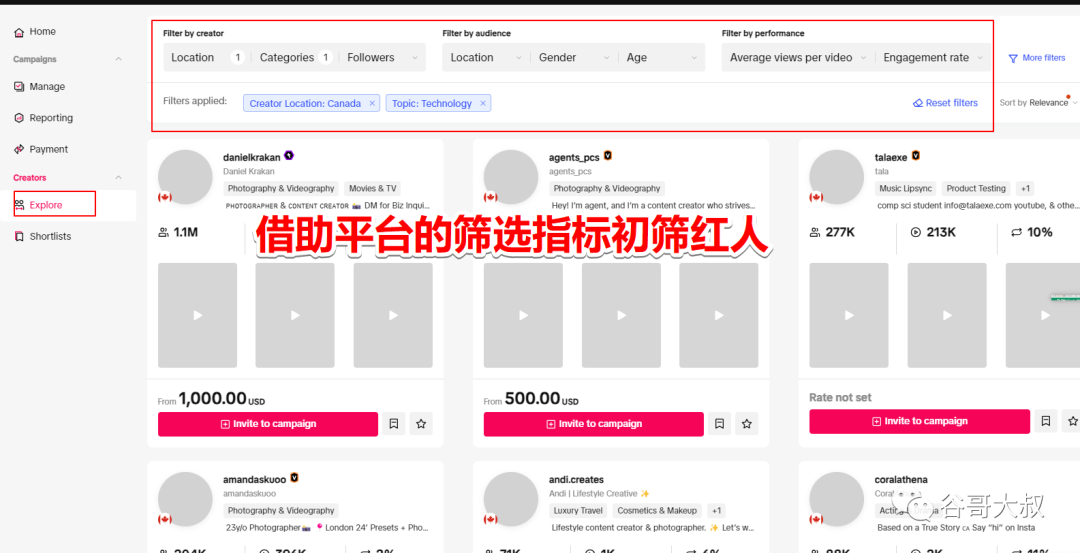 一个Campaign最多可邀请40个红人,但Campaign数量不限。只要红人在创作者市场注册过,就能搜到,还可以看到其账号的相关数据。