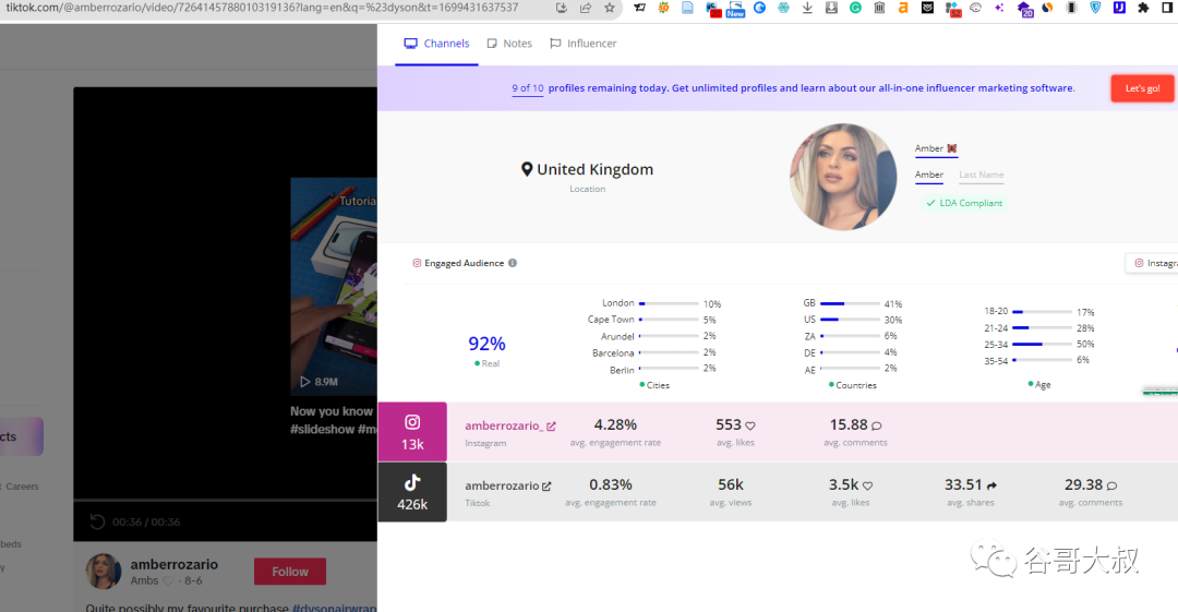 找到红人只是第一步,接下来要进行筛选。而站内搜索出来的红人挑选最大的一个难点是如何分析红人的互动和受众,因为单凭主页很难判断红人来自哪个国家。所以我们有时候会用到一个插件,叫做Influencer Analytics by Upfluence。