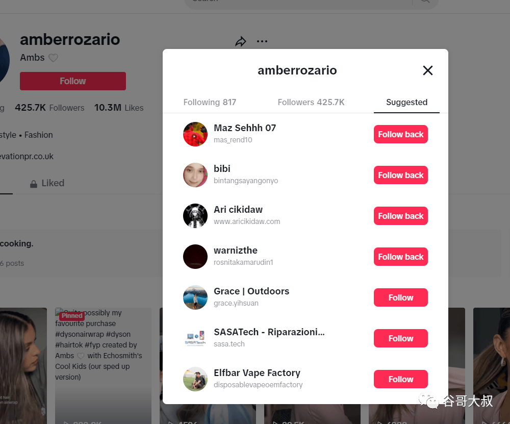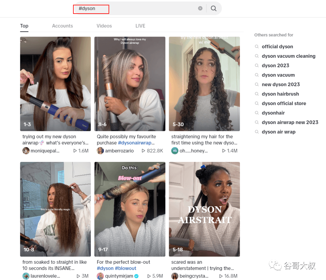 2. 找竞争对手的网红。如果戴森Dyson是竞争对手,那我们可以直接在TikTok里搜索这个品牌,就会发现对应的视频和红人数据。你也可以像上面那样,通过找到的视频拓出更多合适的标签,从而找到更多的网红。