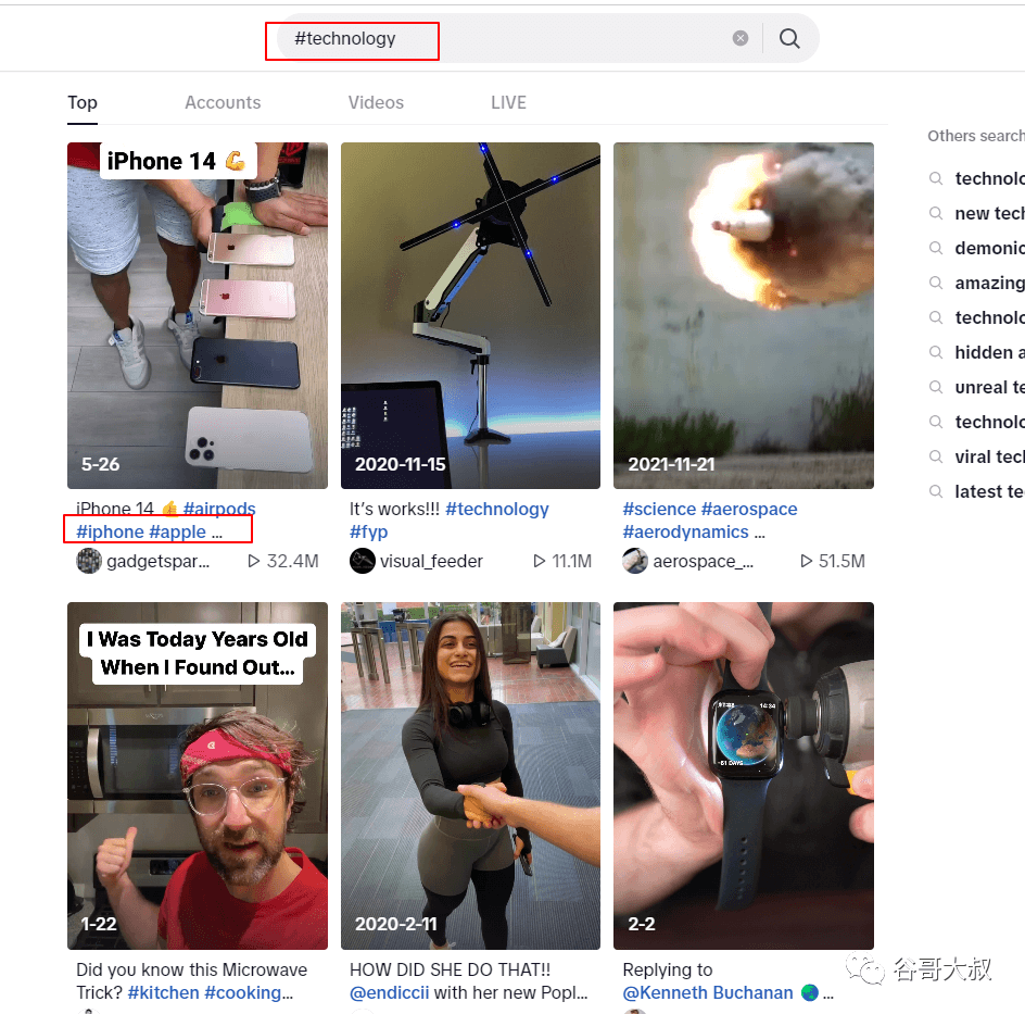 1.直接搜索行业关键词或标签(hashtag#),就会出来很多视频,可以通过视频找到对应的网红进行筛选联系。