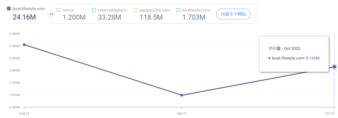 目前,boAt的网站每月流量平均已经达到800万左右,仅直接访问及自然搜索渠道就已经占据整站流量的81%,不愧是在印度TWS耳机市场占有率第一的品牌,品牌知名度非常高。