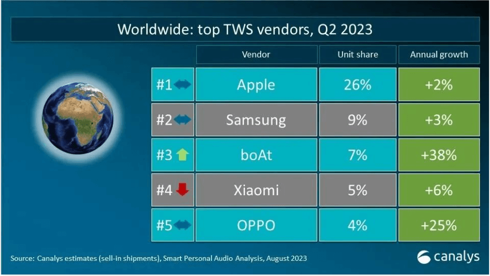 TWS耳机市场的五大厂商中,全球出货量排名第一的是苹果,占比26%;三星排名第二,市场份额占比9%;印度本土品牌boAt紧追其后,以7%的市场份额占据第三顺位。