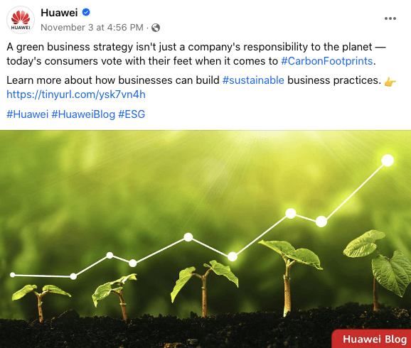 #carbonfootprints(碳足迹)话题是如今全球市场和消费者都在关注的话题。华为在其Facebook全球页上就#carbonfootprints话题标签结合简洁的文字介绍,来展示自身作为全球型科技企业在ESG方面的行动和贡献。