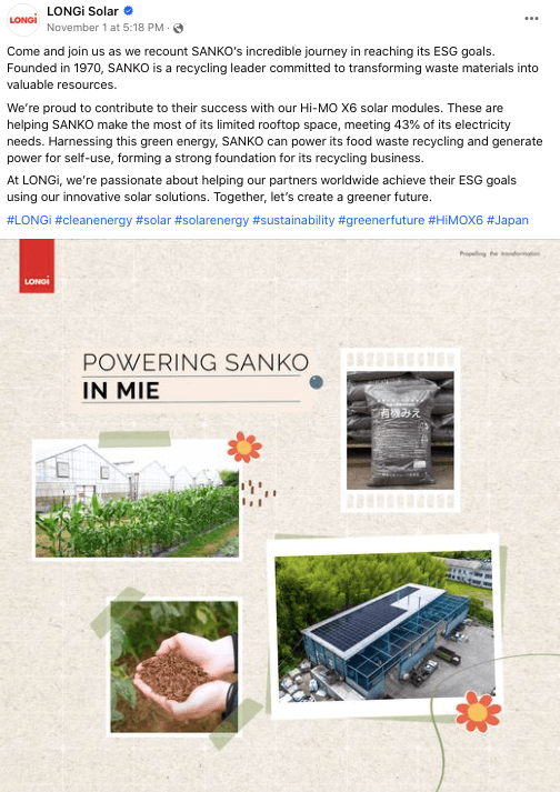 All)”的可持续发展目标。围绕该目标,隆基股份选择在海外社交媒体平台展示自身如何帮助合作伙伴实现ESG目标来体现隆基股份对推动全球ESG进程的重要作用,也赢得了合作伙伴的认同和消费者的赞誉。