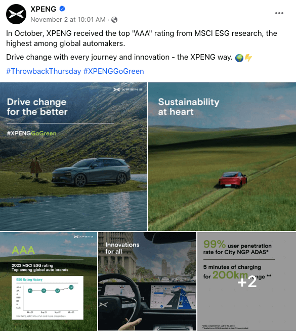 ESG评级的3A评级,这对彰显企业的ESG决心和能力是非常重要的认证,因此小鹏汽车选择在社交媒体上与自己的粉丝及目标受众分享这一好消息。而在选择营销素材的时候,小鹏汽车没有直接使用评级证书作为图片素材,而是将小鹏汽车与绿色生态景致结合在一起,来向自己更年轻的受众群体传达自身在ESG方面的重视和努力。