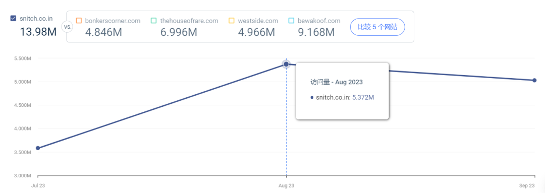 根据similarweb数据显示,其独立站snitch.co.in每月流量已经达到了500万,自2020年7月正式运营开始便呈现持续向上增长的趋势,从0到月均访问超500万不过花了3年的时间。
