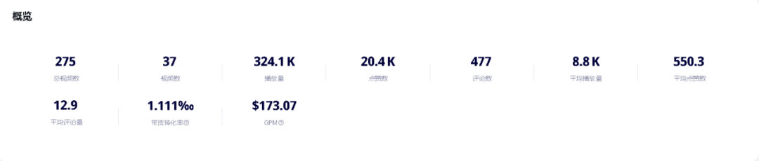 商品的主要带货方式为视频带货,在近30天内产生了275条视频,浏览量达31万,带货转化率(商品销量/视频观看次数)为1.111‰,GPM(每千次视频观看成交额)高达175.94美元。