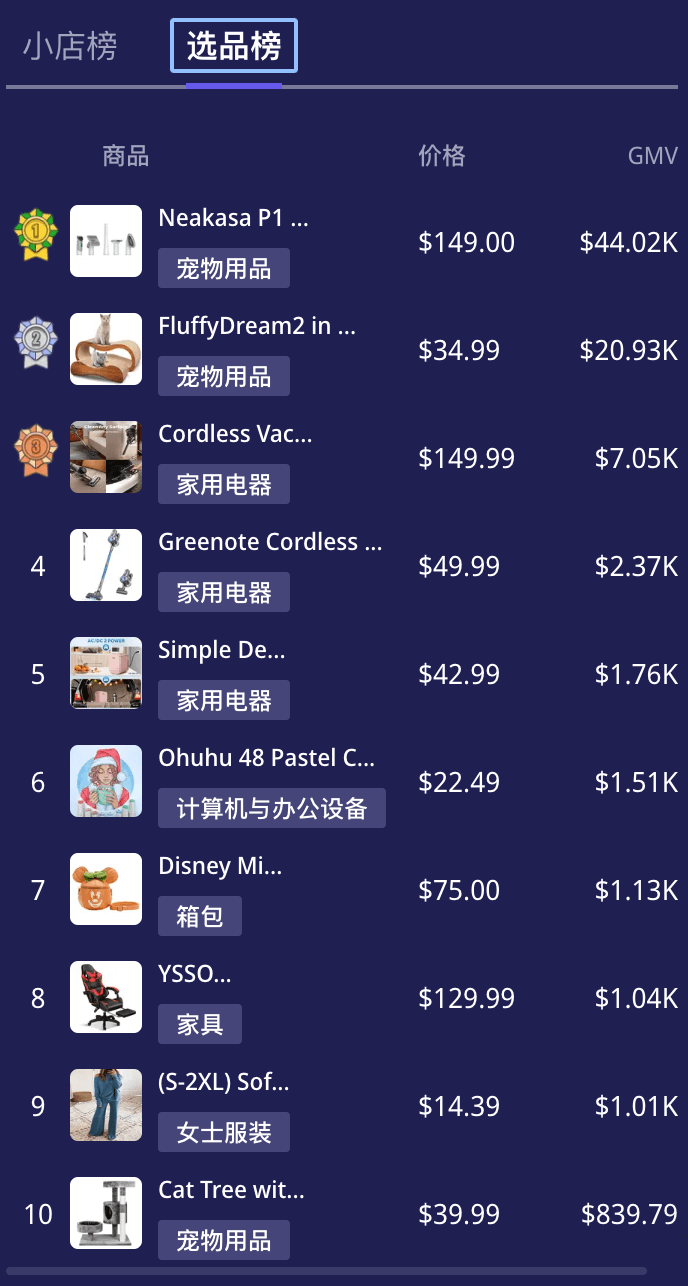 宠物品类在TikTok上目前还处于蓝海市场,且平均客单价较高。在近30天北美宠物用品热销Top20中,仅有Neakasa一家经营宠物护理的小店,它的高客单价也是目前最高的,有供应链优势和品牌能力的卖家不妨参考这一成功案例,加快抢占先机。