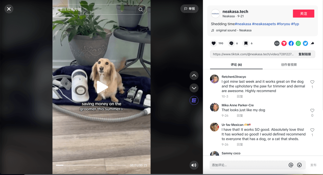 为了解决使用痛点,并消除用户的顾虑,Neakasa在TikTok上通过15-30秒左右的视频,为大家演示整个使用过程。在整个过程中,出镜的宠物都表现乖巧,愉悦地享受主人的服务,它们可爱的脸蛋也无疑是品牌的活招牌和流量保障。