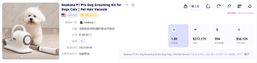 今天给大家带来的爆品分析,是销售额排名Top 4的宠物用品——Neakasa 宠物毛发美容与真空吸尘器套件。它不仅连续四周上榜选品Top 10,而且是2023年9月GMV最高的单品。