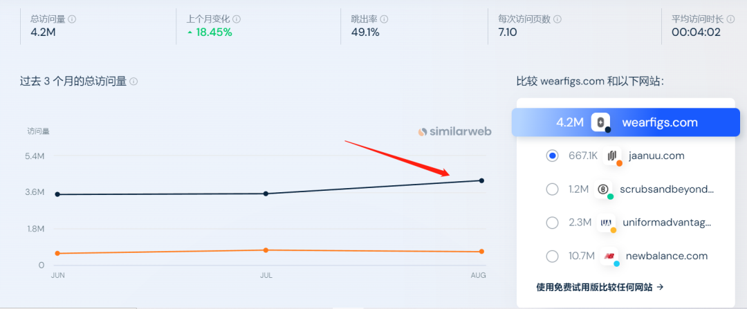 根据similarweb,Figs的独立站wearfigs.com月均访问总量已经超过了400万,其中来自美国地区的流量占比为80%,是美国服装类目的114名,说明即使在整个服装大类目下Figs的表现也已经领先其他服饰品牌,在医疗服饰这个垂类类目更是遥遥领先。