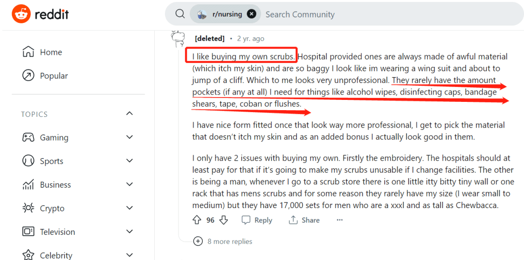 有不少医护人员在社区平台Reddit上吐槽,医院提供的服装不仅品质差,设计还不合理,服装口袋严重不足,因为他们需要随身携带酒精棉片、消毒帽、绷带剪等一系列医疗用品,因此,一款好的设计需要满足消费者的实际需求。