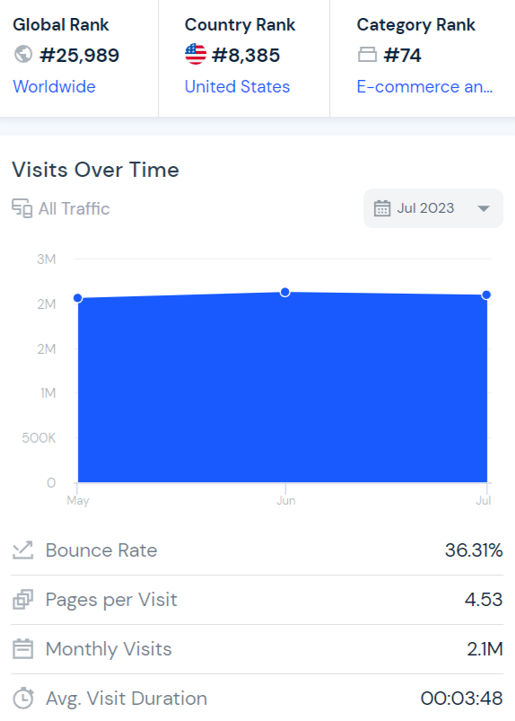 根据similarweb显示,平均每位进站用户可浏览4-5个页面,在网站上的停留时长约为3分48秒,用户跳出率仅在36.31%,这证明Mejuri的网站设计和内容对用户具有较大的吸引力,能够有效地满足用户需求和提供良好的用户体验。