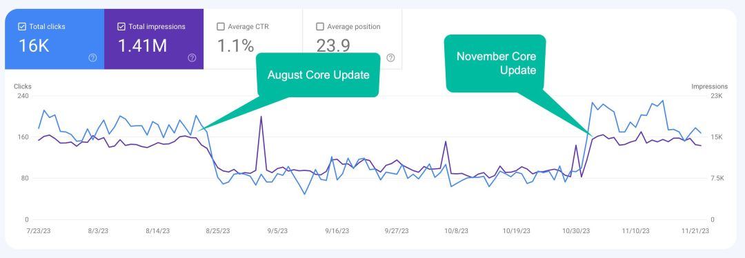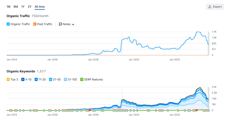 举个例子,这个Affiliate内容站坚持多年的白帽SEO策略,看看今年算法都对它做了什么: