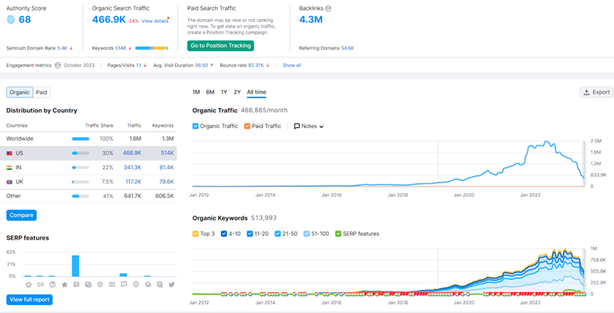 看看下面这个倒霉蛋网站的数据,它的主要盈利方式是出售外链,而且收费也日益昂贵,但内容真的没有太大价值。不过,谷歌算法也不是省油的灯,这网站依靠激进策略快速爬升,结果跌得也快,真是高处不胜寒啊~