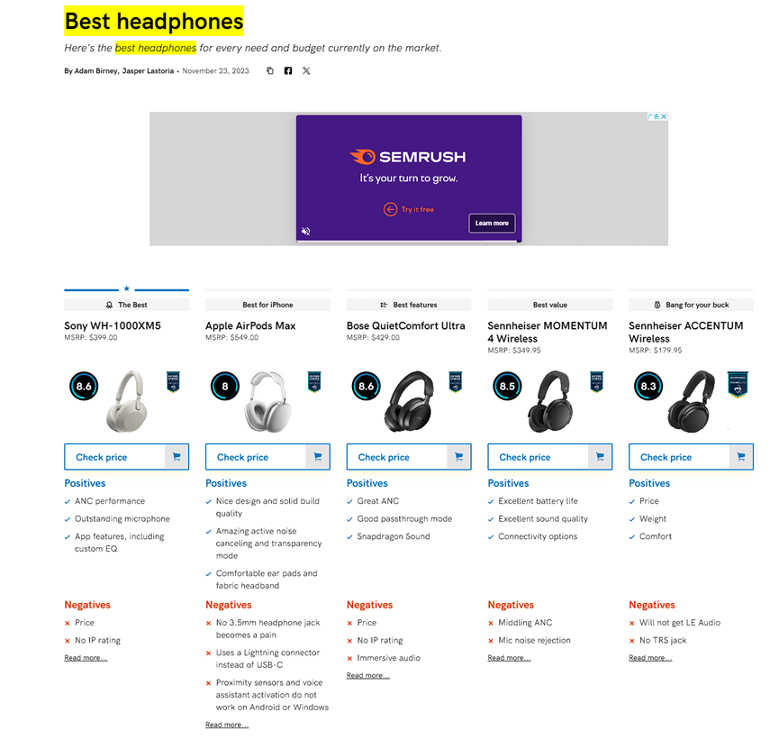 下面再来看一篇以“best headphones”为主题的测评类文章。