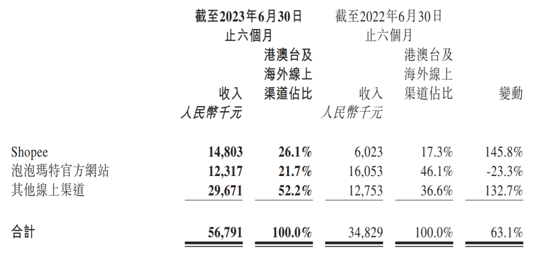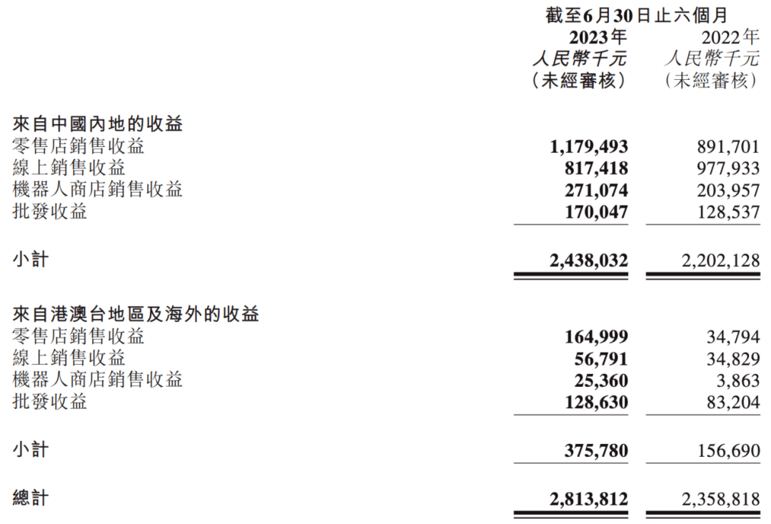 港澳台及海外批发及其他收入从2022年上半年的人民币8320万元增长至2023年上半年的12860万元,增长了54.6%,主要为港澳台及海外业务持续拓展,品牌认可度增加,原有市场以及新兴市场同时发力;
