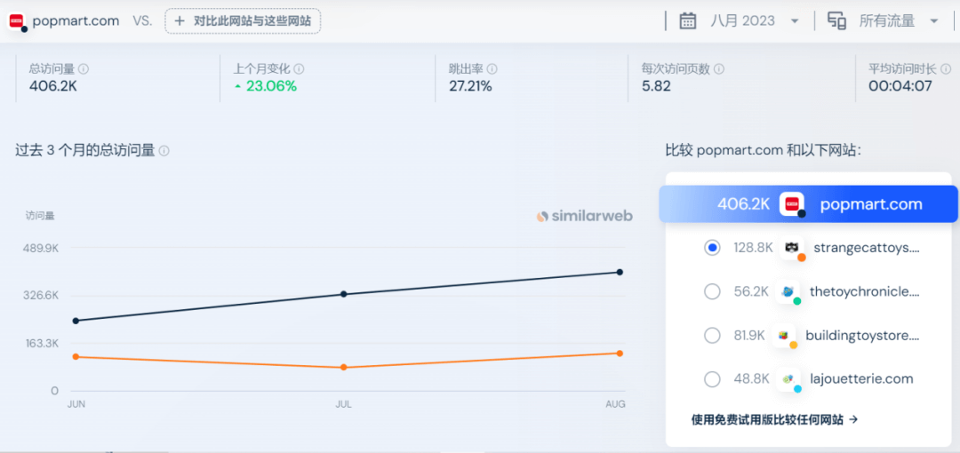 根据similarweb显示,虽然其官网独立站的收入有了一定下降,但是访问量对比去年同期仍有一定的增长,其官网独立站近三个月的访问总量接近百万,月均访问在30-40万期间,同比增长约50%。