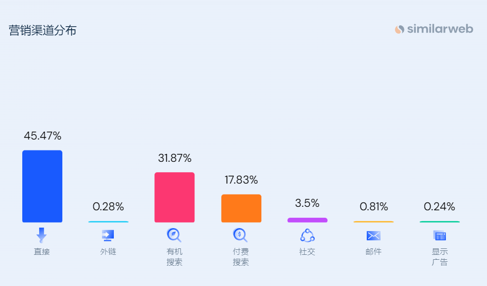 其次,其网站营销渠道分布对比去年也有了明显的变化,去年直接访问为28.36%,今年已增长至45.47%,对比同期增加了近两倍,证明泡泡玛特在品牌曝光度、品牌知名度、用户认可度都有了较大的提升,这就得益于其市场营销方面的有效策略。