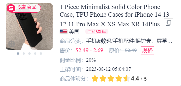 并且,在这个小店里面的销量冠军是一款售价为2.49-2.69美元的手机保护壳。截至目前,该商品总销量为2.24万,总销售额约为6.17万美元,总关联达人441个,总关联直播94个,总关联视频170个。