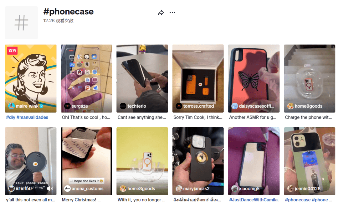 手机壳在TikTok上非常流行,其话题标签曝光量已经超过了120亿次。这一数据充分表明了手机壳在TikTok社区中的热度和受欢迎程度。许多用户都乐于分享他们独特且富有创意的手机壳,这种趋势已经形成了一个庞大的手机壳文化,进一步推动了手机壳市场的繁荣和发展。