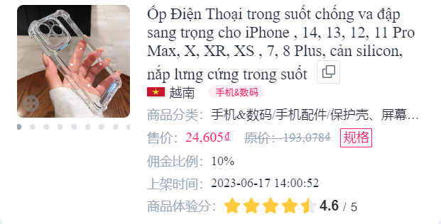 这个小店的销量冠军是一款售价为24,605越南盾的手机保护壳。截至目前,该商品总销量为17.09万,总销售额约为44.22亿越南盾,总关联达人2795个,总关联直播1491个,总关联视频1137个。