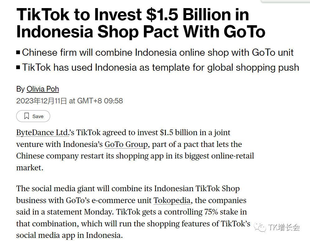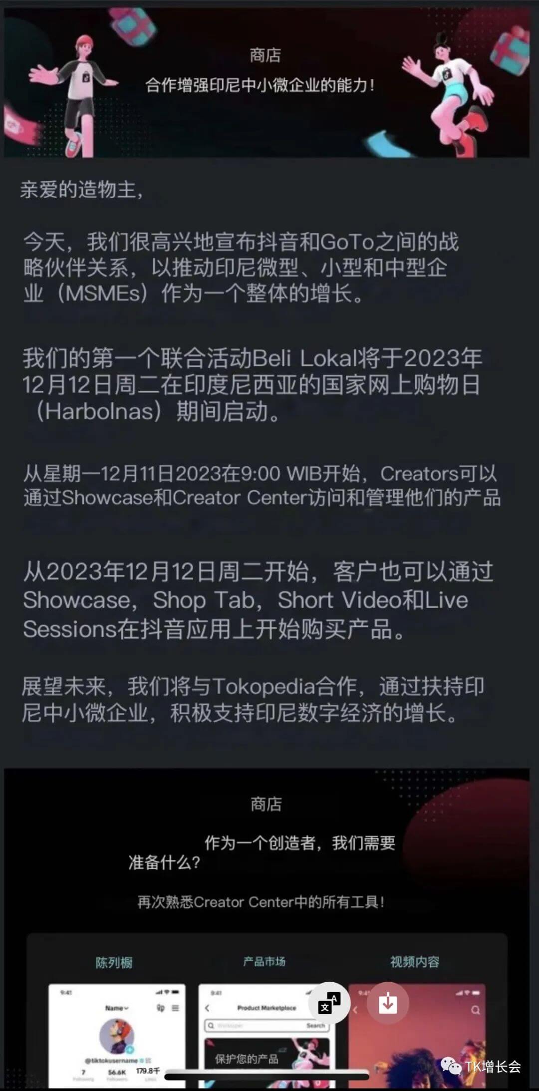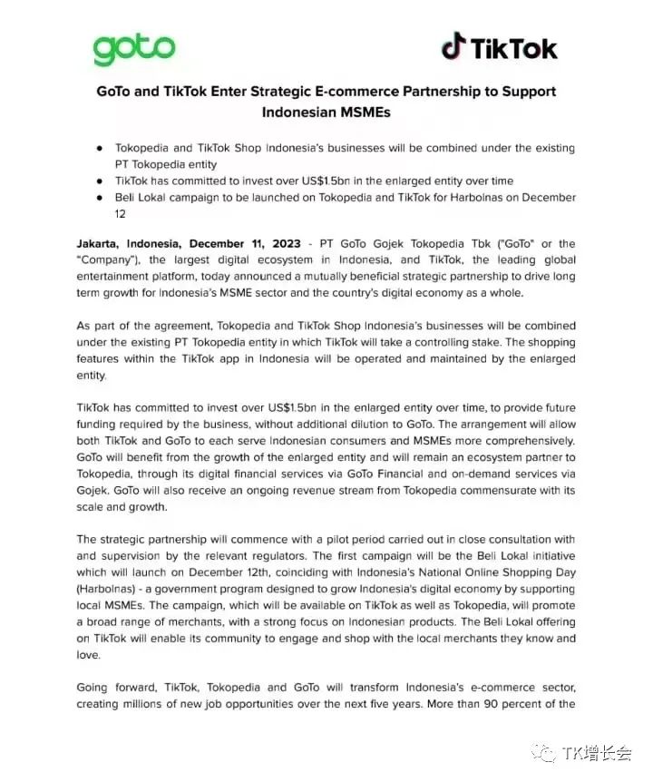 12月11日,TikTok和GOTO集团官宣合作,TikTok电商最大市场印尼恢复上线!