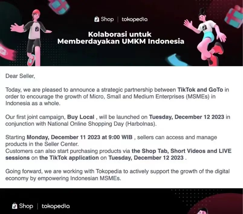 根据双方官方公布的协议,TikTok与印尼GoTo集团达成电商战略合作后,TikTok印尼电商业务将与集团旗下电商平台Tokopedia合并。具体落地方式则为将原Tokopedia和原TikTok Shop印尼的业务,现均整合至新“PT Tokopedia”主体下。