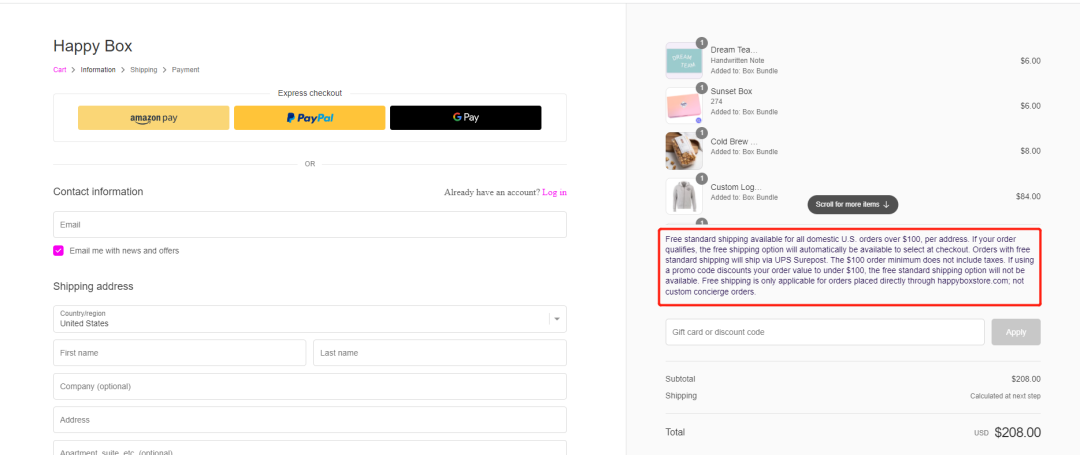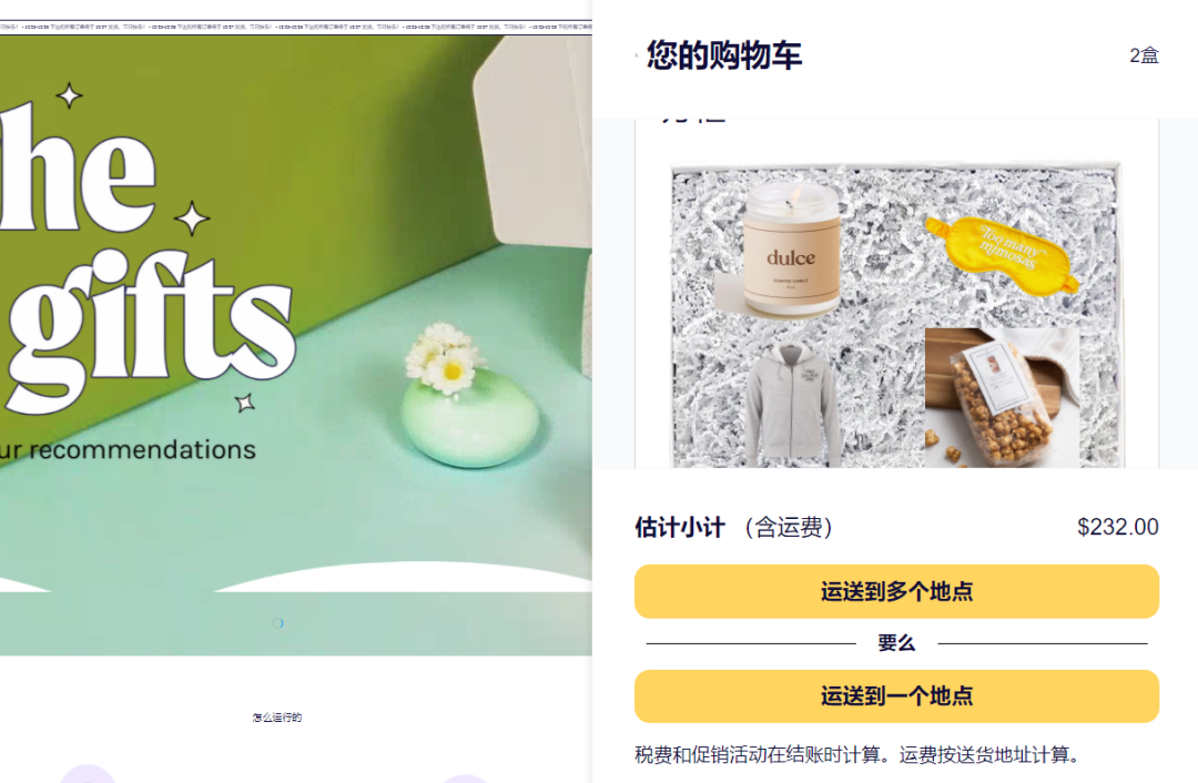 小U加购了两个礼盒,最后结算时还可以选择运送到多个地点或运送到一个地点,并清晰的展示盒子里的内容物明细和图片效果预览。