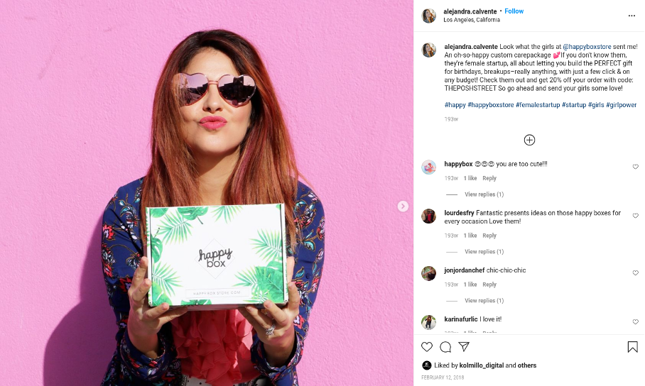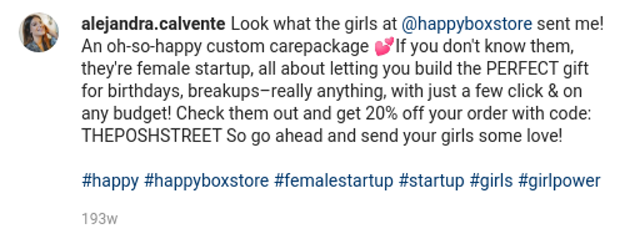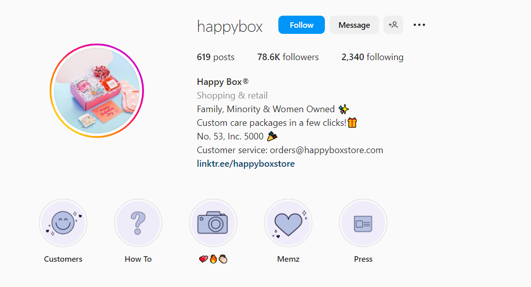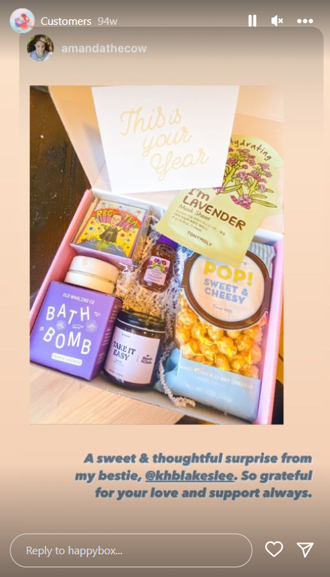 Happy Box 鼓励用户发布关于他们产品的 Instagram Story然后再转发用户发布的内容,并将这些内容保存到他们的主页亮点中,有助于让刚刚了解品牌的消费者产生好感,同时培养客户黏性。