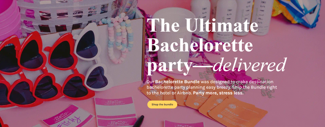 自己就是自己品牌的目标客群的典型代表,可以帮助品牌更好地了解受众,所以一开始 Happy Box 只针对千禧一代女性,还针对单身女郎开发了“Bachelorette Bundle” 终极单身派对的产品套装,包含单身派对的装饰品,拍照道具和招待糖果等。