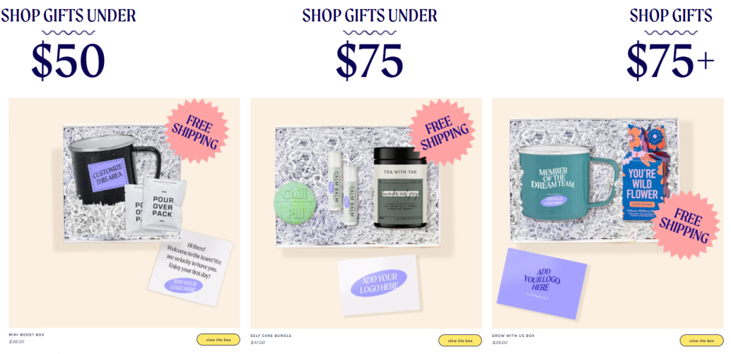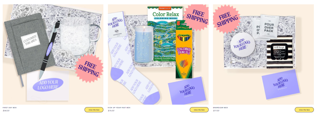 在Happy Box的独立站上可以看到专门的企业专区,在产品分类里也能看见企业礼品的分类。企业礼品支持企业挑选产品并在产品上定制logo,礼盒的外盒也可以进行相应的logo设计,产品选择丰富,售价在36美金到77美金不等。