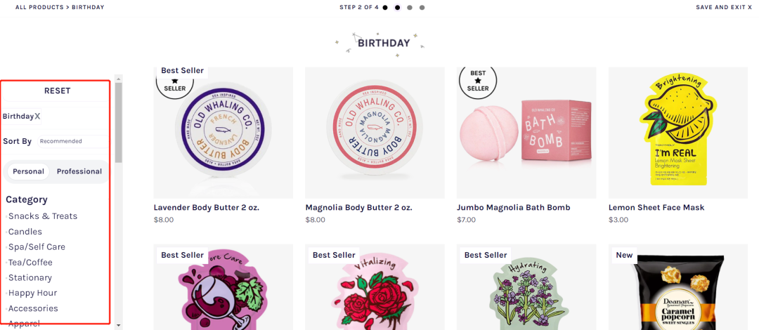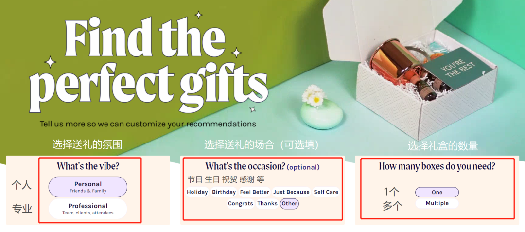 对于线上购买定制产品的消费者来说,购买的便捷性是他们首要的考虑因素。Happy Box选购产品的逻辑非常清晰,首先选择大的分类,是私人送礼还是专业商务送礼,再选择礼物的赠送场合(如假期、生日、祝贺等)。