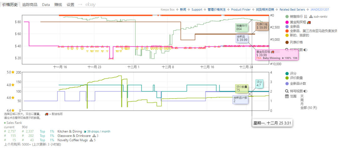 看 Keepa 的数据走势,会发现运营策略还是比较简单的。无非就是先合并一条 Listing 过来,获得冷启动的评价信息,并迅速开启 VINE 计划获得真实用户反馈。