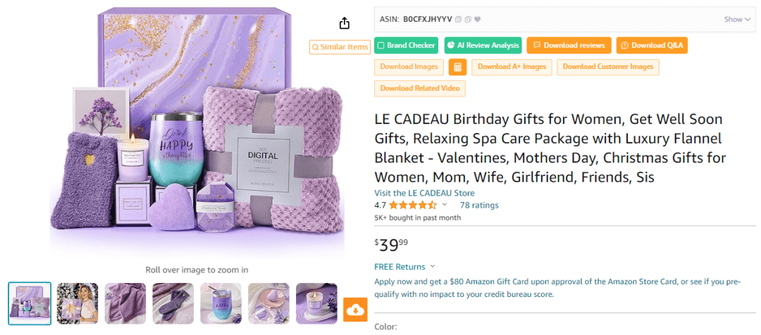 这款产品是我在调研“candle set”这个关键词时发现的,单就首图展示来看,还蛮让人眼前一亮,有让人点击的冲动。不仅仅整体的紫色配色很有视觉冲击力,而且套装中的产品覆盖面很广,完全不同于搜索结果页中的其他产品。