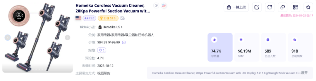 这款产品在近期进行了促销活动,在圣诞节后至近几日期间以$84.99的活动价销售,不足原价的一半,配合美国冬季长假,跨年和圣诞节等特殊时期,一般家庭往往会进行家庭聚会等节假日活动,从而产生家庭清洁的高需求,成功在年底搭上了一波顺风车。根据EchoTik观察,这款产品的销量在圣诞节后日销稳定在900件以上并持续增长,在新年前夕日销更是达到3120件,一跃排到年前最后一周的商品周榜Top 1。