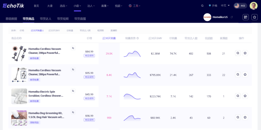 Homeika US是隶属于科技公司Top Housewares INC的新兴吸尘器品牌,在美国本地拥有大型工厂和完整供应链,并且有着Amazon,Walmart等传统电商平台的布局经验和品牌本身的独立站,近期在TikTok平台开设了小店,数月以来销量稳定增长,表现良好。