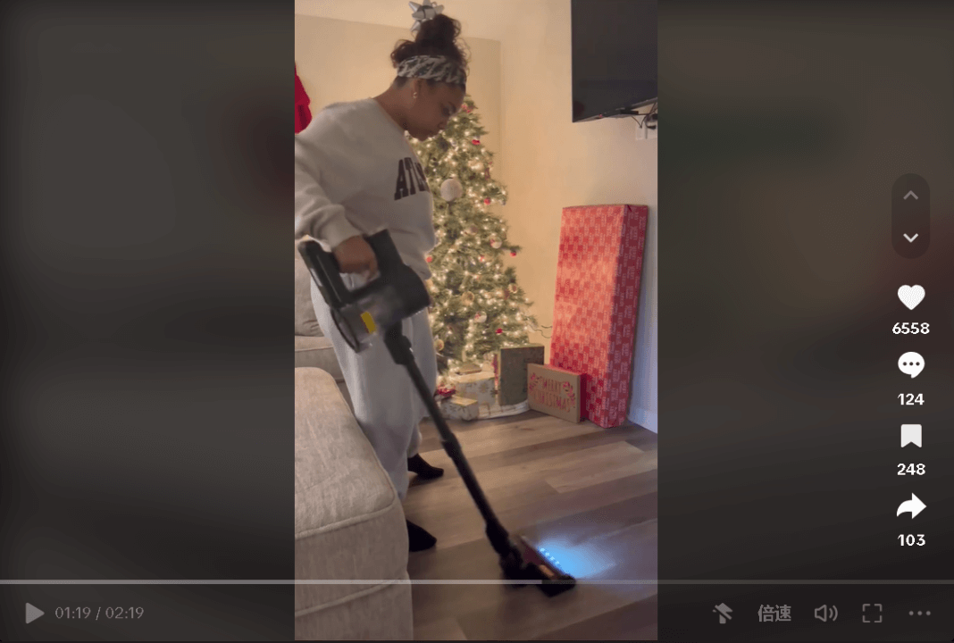 随后,她详尽地介绍了这款吸尘器的多种独特功能和对应的用户痛点,并在不同的使用场景进行操作演示,比如吸尘器的多种功能头可以伸入狭窄的空间进行清洁,两种吸力的调节可用于清理地毯等其余材质的物件,而伸缩功能可以在不需移动沙发或者费力把手伸入沙发底的情况下进行清洁,以充足的信息量提取了产品卖点,并在视频结尾强调这会是一款极好的圣诞礼物,呼应了节日氛围和正在进行的促销活动,最终产生了52万的浏览,4000点赞和186件的销量转化,表现优异。