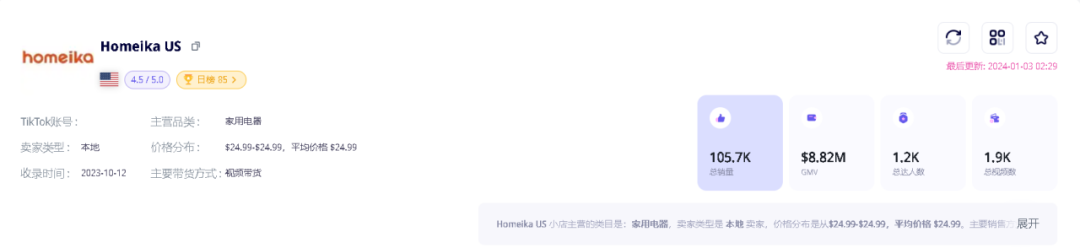 本周为大家带来的小店和爆品分析是一家最近入驻TikTok美国的本土家用电器小店Homeika US,该小店在上周超过百万美元的GMV位列小店榜Top 2。