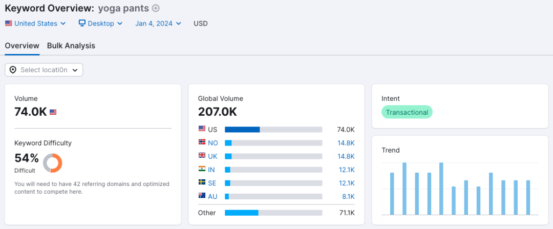 那除了谷歌的数据平台外,再额外看看 SEMRUSH 的数据。发现“yoga pants”这个关键词的月搜索量只有 7.4 万。