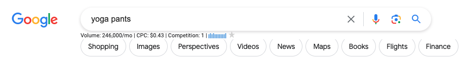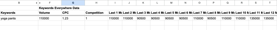 然后试了试 Keywords Everywhere API 的数据,“yoga pants”这个关键词的月搜索量只有 11 万。