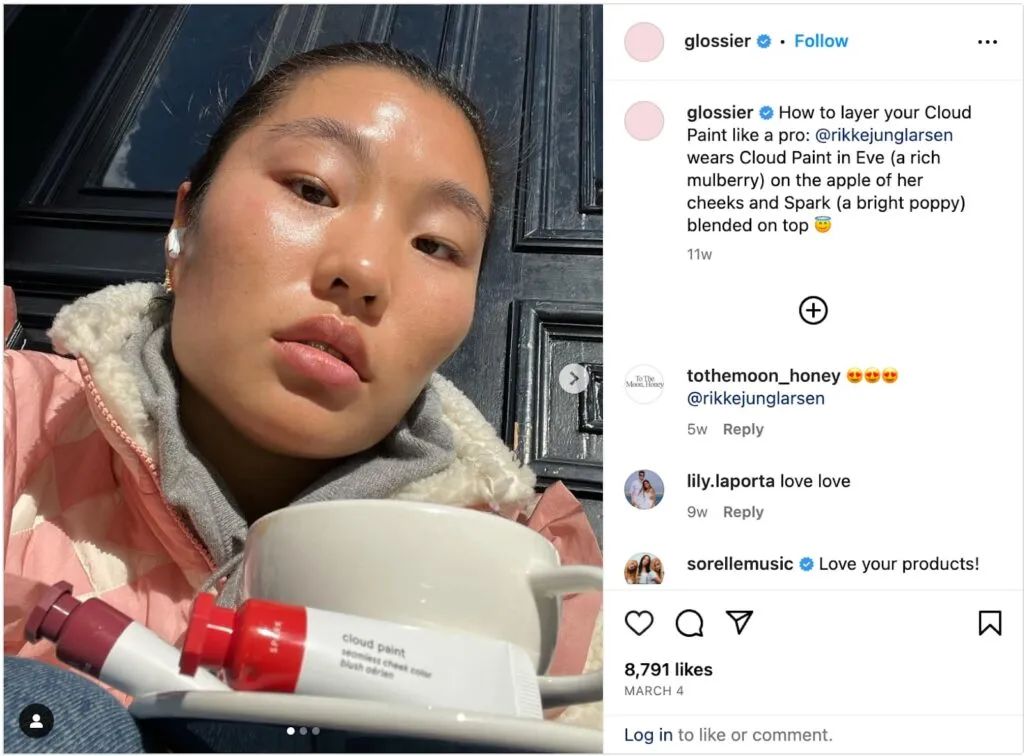 这种真实的方法帮助该品牌建立了忠实的客户社区。Glossier 还在其社交媒体帐户中使用网红营销。精致的网红风格和真实的 UGC 内容非常适合 Glossier 的受众。